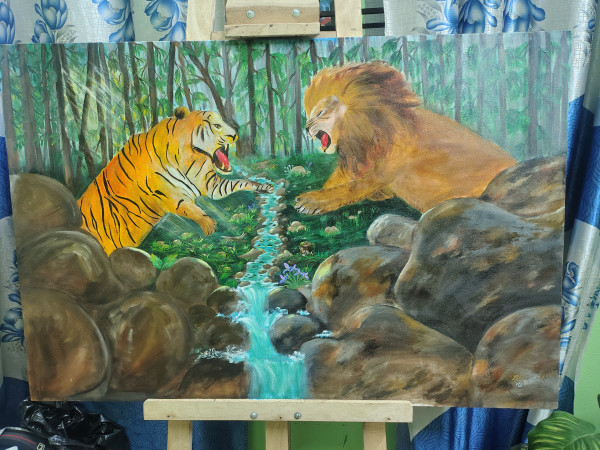 This artwork reveals that nature is both beautifu and fearsome. The clash of power and pride isn't truly between the lion and the tiger -